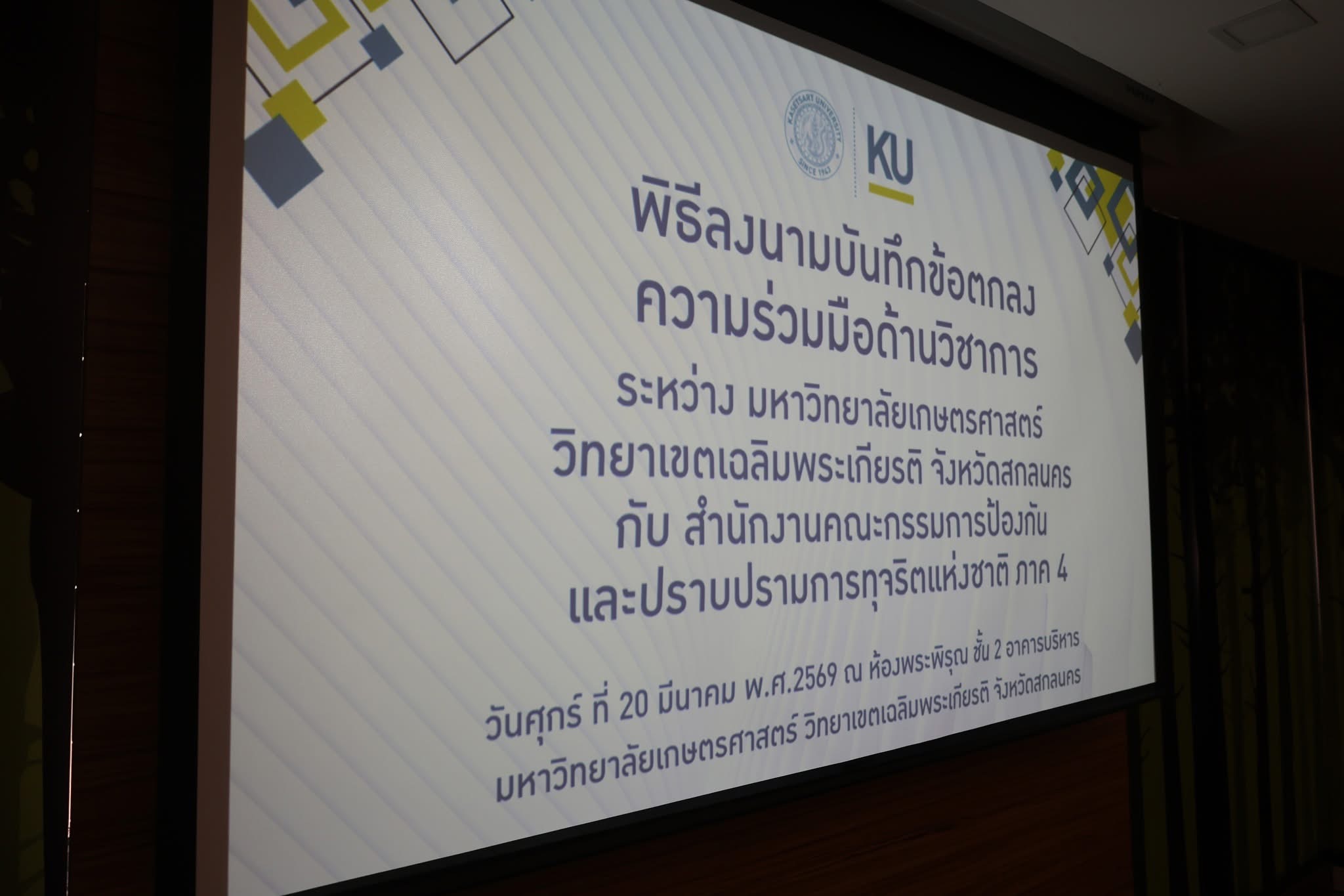 เป็นตัวแทน KUSE เข้าร่วมพิธีลงนามความร่วมมือทางวิชาการ (MOU) ระหว่างมหาวิทยาลัยเกษตรศาสตร์ วิทยาเขตเฉลิมพระเกียรติ จังหวัดสกลนคร กับ สำนักงานคณะกรรมการป้องกันและปราบปรามการทุจริตแห่งชาติ ภาค 4